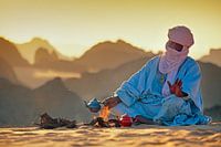 Sahara woestijn. Toeareg man zet thee op het zand bij Djanet, Algerije