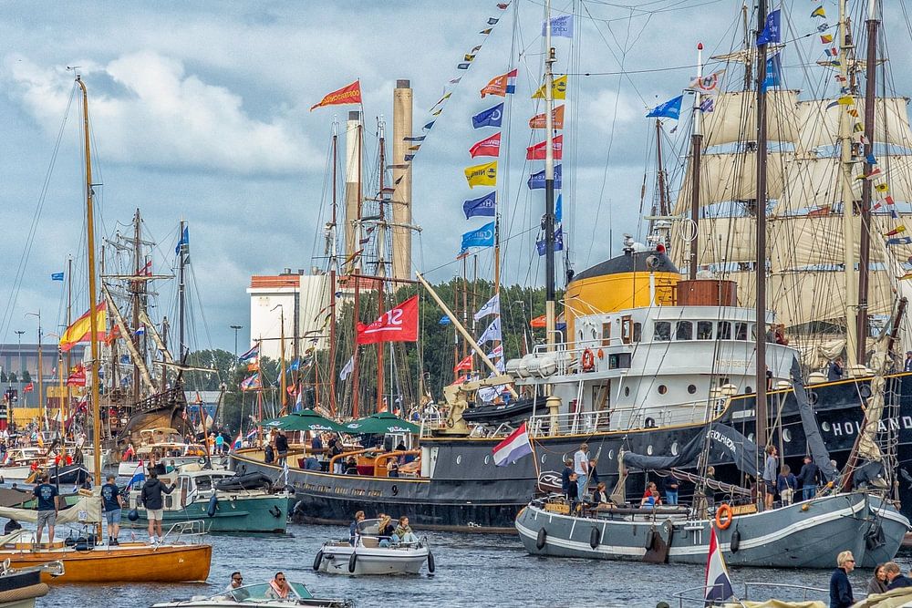 Zeesleper Holland tussen andere bootjes en schepen tijdens de Sail Inn bij IJmuiden wachtend op de Tall Ships om mee te varen naar Amsterdam