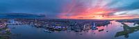 Kampen en de IJssel tijdens de traditionele vlootschouw bij de start van het 2024 Sail Kampen evenement in de Hanzestad aan het einde van een lentedag met een kleurrijke zonsondergang aan de hemel.