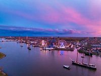 Kampen en de IJssel tijdens de traditionele vlootschouw bij de start van het 2024 Sail Kampen evenement in de Hanzestad aan het einde van een lentedag met een kleurrijke zonsondergang aan de hemel.