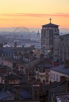 Kathedraal Saint-Jean-Baptiste in Vieux Lyon en het reuzenrad op Place Bellecour in Lyon tijdens een kleurrijke zonsopkomst in december.