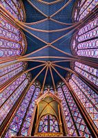 Prachtige opname van het plafond en het paarse glas in lood interieur van de Sainte-Chapelle kapel in Parijs, Frankrijk
