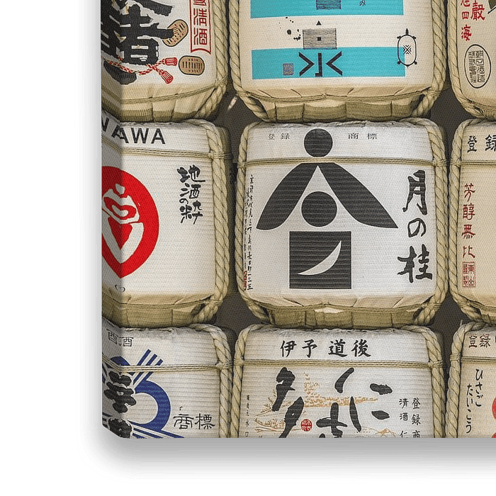 Sake vaten op een stapel met mooie bedrukking van text en tekeningen in het Japans. Sake is een alcoholische drank typisch voor Japan.