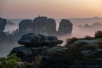 Hier is een foto bij zonsopgang - de rotsen zijn nog in nevelen gehuld.