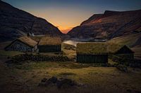 Saksun oud dorp bij winterse zonsondergang, Faeröer-eilanden