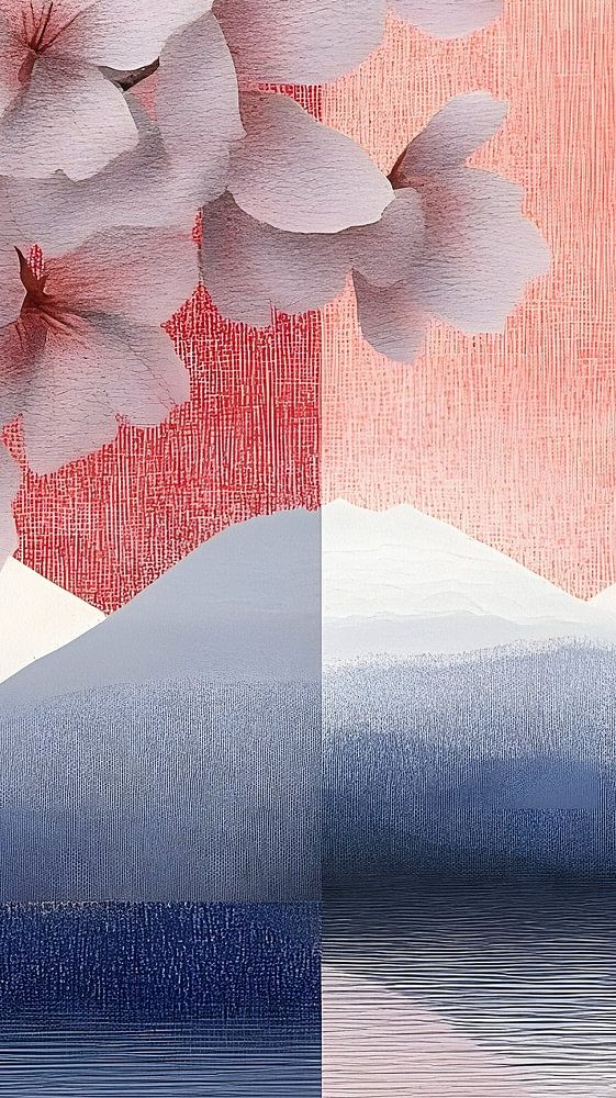 De delicate kersenbloesems contrasteren prachtig met een grote rode zon en het serene berglandschap, waardoor een harmonieuze weergave van de Japanse natuur en cultuur ontstaat.