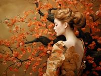 Abstract profiel portret van een mooie stijlvolle vrouw in een goudkleurige zijden jurk met open rug en opgestoken haar tegen een gouden achtergrond met oranje kersenbloesem.