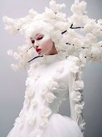 Portret van een vrouw in een witte jurk met Japanse bloesem.
