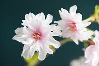 Close-up foto van bloeiende Prunus. Wit / roze bloemen. Gefotografeerd in mijn atelier met een door mijzelf in aqua / blauwgroene / turquoise tinten beschilderd achtergronddoek.