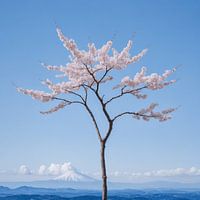 In dit schilderij staat een bloeiende kersenboom tegen de achtergrond van een blauwe hemel en de majestueuze Mount Fuji. De delicate roze bloesems contrasteren prachtig met de heldere lucht en de witte sneeuwtop van de berg. Dit kunstwerk symboliseert de vergankelijke schoonheid van de natuur en de kracht van eenvoud.