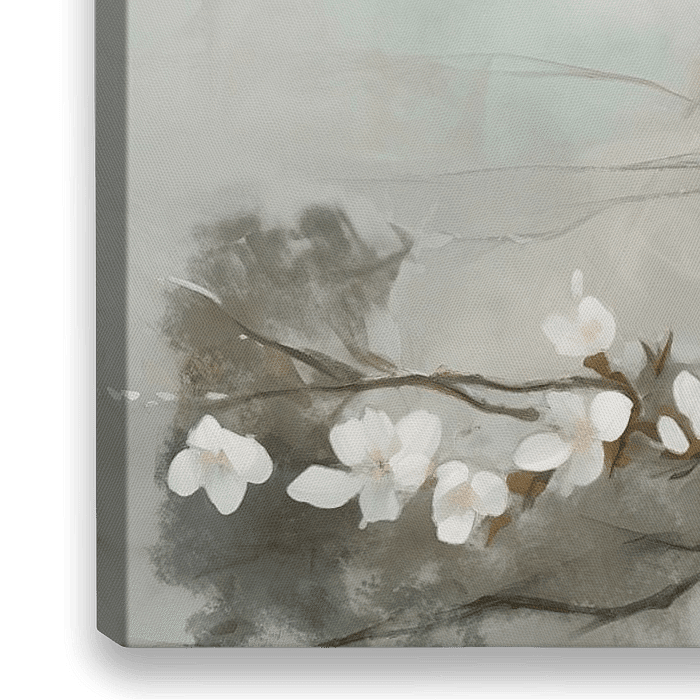 Abstract mixed media schilderij van kersenbloesem in zacht groen en aardetinten.