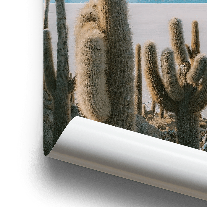 Een foto van cactuseiland in Salar de Uyuni, Bolivia. Een eiland te midden van een zoutvlakte met niks anders dan cactussen.