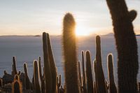 Een foto van cactuseiland in Salar de Uyuni, Bolivia. Een eiland te midden van een zoutvlakte met niks anders dan cactussen.