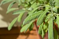 Close-up van een salie in een kruidentuin na een zomerse regenbui.