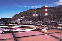 Zoutwinning locatie in het zuidelijkste puntje van La Palma met reflectie van de vuurtoren. De zoutpannen zijn erg fotogeniek.