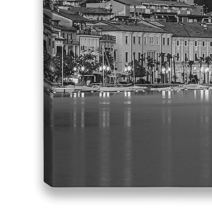 Een 2:1 stadsgezicht in zwart-wit van een avond in Salò, een stad gelegen aan het Gardameer in de regio Lombardije in het noorden van Italië. Salo heeft tevens de langste promenade langs het Gardameer.
