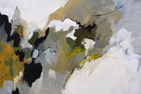 Een mix van gedurfde en gedempte kleuren vormt een abstracte compositie met dynamische streken en spatten. Witte en grijze vlakken vormen een evenwicht tussen de zwarte, groene en okerkleurige vlakken en geven de indruk van een spontane en expressieve creatie.