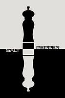 Een minimalistische afbeelding van een gestileerd peper en zout stel, verdeeld in zwart-witte helften. Het ontwerp benadrukt een strak, modern grafisch ontwerp.