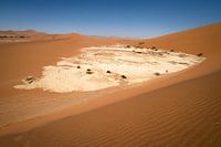 Een zoutpan in de Sossusvlei waar gezien de fijne zandstructuren nog bijna niemand had gelopen. Het contrast van het witte zout met het zand en de lucht vond ik mooi om vast te leggen.