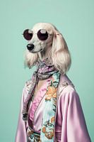 Elegantie in zijn puurste vorm: De Saluki met zijn sneeuwwitte vacht en majestueuze verschijning belichaamt gratie. Omlijst door een glinsterende zonnebril en een stijlvolle sjaal straalt hij een vleugje luxe en speelsheid uit. Dit buitengewone dier presenteert zich trots en charmant tegelijk, alsof hij de ster van een glamoureuze modeshow is.