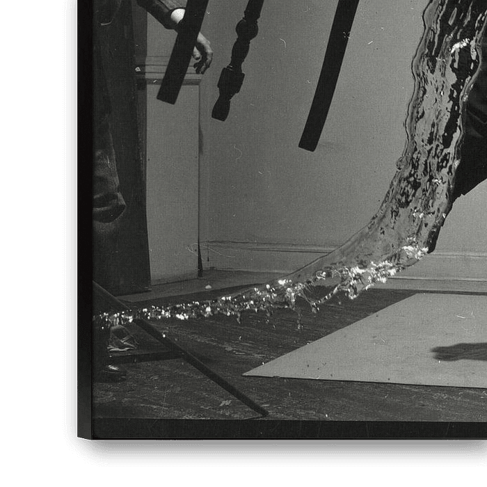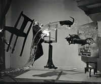 In 1941, American photographer Philippe Halsman met the surrealist artist Salvador Dalí in New York City and they began to collaborate in the late 1940s. The 1948 work Dali Atomicus explores the idea of suspension, depicting three cats flying, water thrown from a bucket, an easel, a footstool and Salvador Dalí all seemingly suspended in mid-air. The title of the photograph is a reference to Dalí's work Leda Atomica (at that which can be seen in the right of the photograph behind the two cats.) Halsman reported that it took 28 attempts to be satisfied with the result. This is the unretouched version of the photograph that was published in LIFE magazine. In this version the wires suspending the easel and the painting, the hand of the assistant holding the chair and the prop holding up the footstool can still be seen.