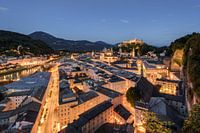 Uitzicht vanuit Mönchsberg op de oude binnenstad van Salzburg en de vesting Hohensalzburg op de achtergrond.