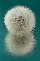 "Samen: Alleen met de abstracte reflectie" is een macrofoto van een pluizenbol van een gewone Paardenbloem. Deze pluizenbol ligt op een spiegelend oppervlak, waar kleine druppeltjes op liggen. Ook de pluizenbol zelf draagt kleine waterdruppeltjes. Als je inzoomt op de paardenbloem kun je goed zien hoe mooi detailrijk deze foto is. Bij het maken van deze foto heb ik gekozen voor een relatief kleine scherptediepte. Hierdoor ligt de scherpte bij de "hartjes" van de voorste pluisjes. Als je verder naar achter gaat kijken (en naar voren) neemt de scherpte af en vervagen de druppels en pluisjes. Zo komt de aandacht op de voorkant te liggen en ontstaat er daarnaast ook een gevoel van diepte in het werk. De achtergrond heeft een licht gemêleerde petrol kleurige achtergrond.