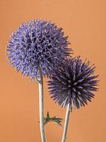 "Samen: Eenvoudig portret van twee distelbollen" is een macrofoto van twee distelbollen (een bloeiende distelbol aan de linkerzijde en een distelbol die nog net niet in bloei staat aan de rechterzijde).