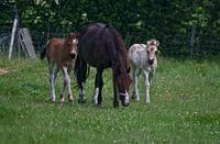 Merrie met haar eigen veulen en z'n vriendje gezellig in de wei.