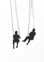 Een minimalistische lijntekening, uitgevoerd in zwarte inkt op een volledig witte achtergrond, toont twee mensen die samen op de schommel zitten. Lange, dunne touwen hangen sierlijk van de schommel, terwijl de figuren met eenvoudige vormen en lijnen zijn getekend. Met minimale details weet deze tekening toch een gevoel van verbondenheid en vreugde over te brengen, door de elegante en speelse compositie. De eenvoud van de lijnen en vormen benadrukt de puurheid van het moment, waardoor de tekening een serene en tijdloze uitstraling krijgt.