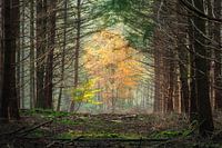 Aan het einde van een tunnel bomen staan twee opvallende bomen. Ouder en kind. De een oranje de ander nog groen. Een lichte nevel en prachtig licht zorgt voor een bijzondere sfeer