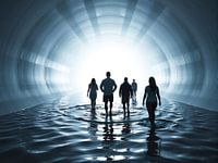 Stap in een symbolische reis met Samen naar het Licht, een krachtig en inspirerend kunstwerk dat de essentie van een collectieve zoektocht naar hoop en vernieuwing uitbeeldt. De scène toont een groep mensen die door een ondergelopen tunnel loopt, richting een helder, uitnodigend licht aan het einde. Het water onder hun voeten…