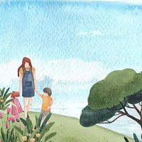 Dit kunstwerk legt een rustig moment van samenzijn vast wanneer een moeder hand in hand met haar twee jonge kinderen door een zachtgroen landschap loopt. De open blauwe lucht creëert een gevoel van ruimte en rust, terwijl zachte details zoals kleine bloemen, gelaagde planten en een ronde boom warmte en evenwicht toevoegen aan de…