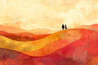 Een sfeervol digitaal kunstwerk dat twee silhouetten toont op een heuvelrug, badend in warme herfsttinten van oranje, rood en goud. De golvende landschapslijnen creëren een dromerige atmosfeer, terwijl de kleine figuren op de top een intiem moment delen tegen een zacht bewolkte hemel.