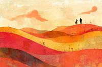 Een sfeervolle digitale illustratie in warme oranje en rode tinten toont een golvend heuvellandschap onder een zachtgele hemel. Op de hoogste heuvel staan twee silhouetten die het rustgevende panorama aanschouwen, terwijl kleine plantjes en bloemen het landschap subtiel decoreren. De zachte, vloeiende lijnen en warme kleurgradiënten creëren een dromerige, bijna nostalgische sfeer.