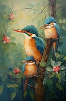 Drie ijsvogels rusten samen op een tak, omringd door fris groen en bloeiende roze bloemen. Het warme oranje en helderblauw van hun verenkleed licht prachtig op in het zachte zonlicht. Samen op de tak (2) ademt rust en samenzijn, vastgelegd in heldere, mozaïekachtige penseelstreken die het tafereel een levendige en eigentijdse…