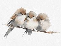 Drie pluizige vogeltjes zitten dicht tegen elkaar aan op een dunne tak, geschilderd in zachte aquareltinten van beige, warm bruin en koel grijs. Hun ronde lijfjes raken elkaar bijna, waardoor een gevoel van verbondenheid en warmte ontstaat. De achtergrond is helder wit, met zichtbaar papierstructuur, wat de kwetsbaarheid en lichtheid…