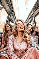 De vrouwen zijn stijlvol gekleed en stralen zelfvertrouwen uit. Hun gezamenlijke lach werkt aanstekelijk en weerspiegelt de geest van de hedendaagse digitale nomaden die werk, reizen en vriendschap combineren. De omgeving in de bus is helder en vriendelijk, met zacht licht dat door de ramen naar binnen valt en de scène een warme gloed geeft.