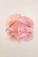 "Samen tot het einde: Twee "knuffelende" gedroogde blaadjes" is een foto van twee prachtige gedroogde blaadjes van een Bougainvillea. Deze plant kwam ik tegen in Lanzarote. (Deze mooie plant heeft een warm klimaat nodig!) Deze blaadjes zitten met een paar aan elkaar vast. Deze blaadjes, die hier gefotografeerd zijn, zijn van de plant afgevallen en gedroogd in het heerlijke Spaanse zonnetje. Hierdoor is het blad meer doorzichtiger geworden en lichter van kleur en de nervenstructuur is hierdoor veel beter te zien. De pastelkleuren zacht roze en oranje kleur geven een rustige uitstraling aan de foto. De blaadjes liggen op een aparte ondergrond waardoor ze op een abstracte wijze gespiegeld worden. Het spiegelbeeld lijkt bijna schilderachtig. Als je inzoomt op de foto is dit goed te zien.