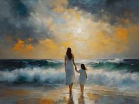 Dit prachtige schilderij toont een intiem moment tussen moeder en kind, wandelend hand in hand langs het strand bij zonsondergang. De lucht is gevuld met warme tinten, terwijl het licht van de ondergaande zon door de woeste golven breekt, wat een magisch effect van licht en schaduw creëert. De lichte penseelstreken en zachte kleurvariaties geven het werk een impressionistische stijl, met veel aandacht voor sfeer en emotie.