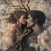 Dit betoverende kunstwerk vangt het diepe en tijdloze thema van verbondenheid. Een man en een vrouw worden afgebeeld als één geheel, hun lichamen samengesmolten met de kronkelende wortels van een oude boom. Deze beeldspraak staat symbool voor de complexe en prachtige verwevenheid van menselijke relaties, de kracht van liefde, en onze natuurlijke verbinding met de aarde.