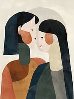 Dit kunstwerk toont een abstracte weergave van twee figuren die tegenover elkaar staan, hun gezichten dicht bij elkaar, waardoor een gevoel van intimiteit en verbondenheid wordt gecreëerd. De stijl is minimalistisch en Scandinavisch geïnspireerd, met gebruik van eenvoudige lijnen en vormen.