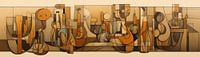 Samenspel - Het panoramische canvas is een spel van overlappende, organische vormen en geometrische blokken, uitgevoerd in een warm, aardetinten palet met accenten van oranje en bruin tegen een neutrale achtergrond. De geabstraheerde stijl en het subtiele gebruik van schaduwen verlenen het werk diepte, terwijl het lijnenspel de compositie met een zachte dynamiek verrijkt.