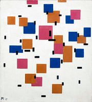 Compositie in kleur A bestaat nog steeds uit ritmisch gearrangeerde kleurvlakken, maar in de jaren die volgen doet Mondriaan elke suggestie van beweging en diepte in zijn schilderijen weg en gebruikt hij alleen rood, geel en blauw.