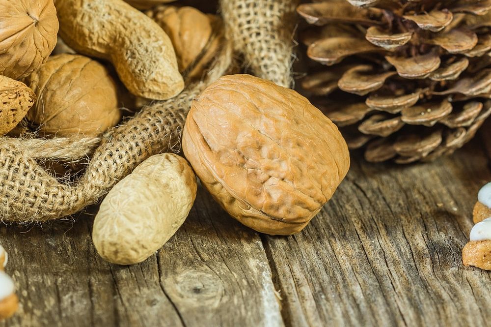 De samenstelling van het Kerstmisvoedsel van noten in de zak van de kerstman, de koekjes en de vruchten van de stervorm, Kerstmiskaart, Kerstmisornamenten, Kerstmisdecoratie