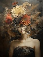Een donker, abstract en surrealistisch uitziend portret van een vrouw met weelderige, fantasierijke bloemdecoraties die als een prachtige kroon op haar hoofd troont. De bloemen zijn geschilderd in warme, intense herfsttinten - diepe tinten rood, oranje en bruin, die een warme, mysterieuze sfeer creëren. De bruine achtergrond versterkt de herfststemming en geeft het schilderij een aardse diepte. De abstracte weergave van het gezicht en de weelderige, artistieke bloemdecoratie vormen samen een surrealistische compositie die zowel magisch als mysterieus is en de kijker meeneemt naar een dromerige herfstscène.