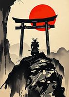 Een eenzame samoerai staat op een rotspunt, afgetekend tegen een grote rode zon. Hij is gekleed in een traditioneel harnas en houdt een zwaard aan zijn zijde. Achter hem staat een torenhoge torii poort, een traditionele Japanse poort. De achtergrond is een mistig landschap met bergen en een rotsachtige rotswand.