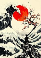 Op de afbeelding staat een samoerai op een rots, silhouet tegen een achtergrond van gestileerde golven en een grote rode maan. Rechts van de maan staat een kersenbloesemboom met rode bloemen. De golven zijn afgebeeld in witte en blauwgrijze tinten, waardoor een dynamische en woelige zee ontstaat. De algehele sfeer is sereen en toch…