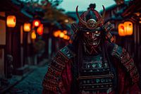 Een majestueuze krijger in een adembenemend harnas stapt door een mysterieus steegje, verlicht door zachte lantaarns. De glimmende helm en glanzende ogen trekken ieders aandacht. Dit fascinerende kunstwerk is perfect voor in de woonkamer, waar het verhalen kan vertellen over moed en traditie.