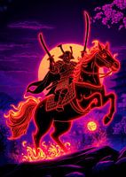 Een gestileerde illustratie van een samoerai te paard, weergegeven in een levendige retro-futuristische neon-esthetiek.